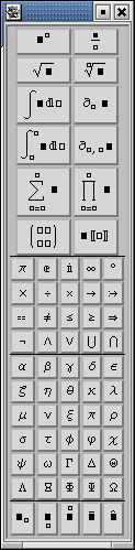 При старте открывается рабочее окно, в котором отображаются ввод и вывод программы. В верхней его части находится меню, позволяющее выполнять различные действия, в том числе сохранение текущей сессии в файле с расширением nb. Кроме основного окна в работе участвуют так называемые палитры. Если они не появились при старте, то для их открытия можно воспользоваться пунктом Palettes из меню File. Палитра Basic Input предоставляет набор кнопок для ввода наиболее употребительных символов, таких как корни, дроби, интегралы, буквы греческого алфавита и т. д. Палитра Basic Calculations содержит шаблоны для вычисления основных алгебраических функций.