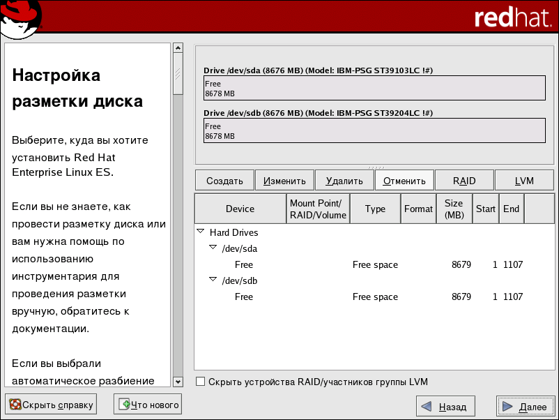 Программный RAID можно настроить в процессе графической или текстовой установки, а также во время установки kickstart. В этой главе обсуждается настройка программного RAID во время установки, с использованием программы Disk Druid.
