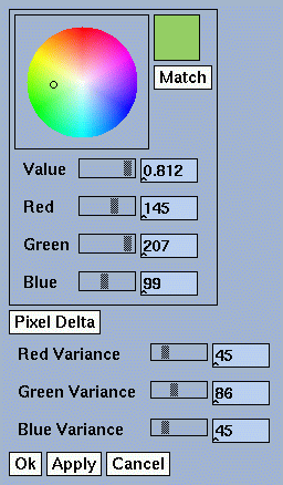 Затем задаются три числа, задающих диапазоны изменения, -- так называемая RGB-окрестность цвета - диапазон красной, зеленой и синей компонент. RGB-окрестность можно задать, выбрав граничный цвет с помощью кнопки Pixel Delta (ее действие аналогично Match). Далее можно: