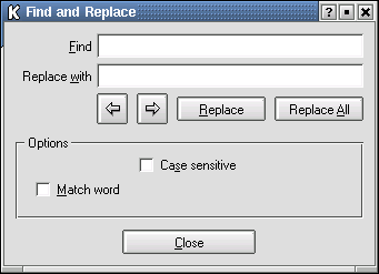 Нажатие на кнопку Replace производит замену найденного вхождения на новое. При задании опции Case sensitive поиск происходит с учетом регистра букв. Опция Match word обеспечивается поиск тождественно совпадающих слов, например, при поиске слова "кот" слово "скот" не будет найдено.
