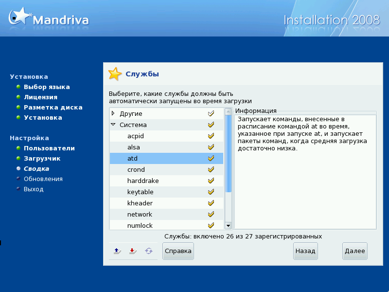 Это окно позволяет выбрать, какие службы будут автоматически запускаться при загрузке: DrakX представит список всех доступных в данной системе сервисов. Внимательно ознакомьтесь с каждой их них и снимите галочки с тех, которые не нужно запускать при загрузке.