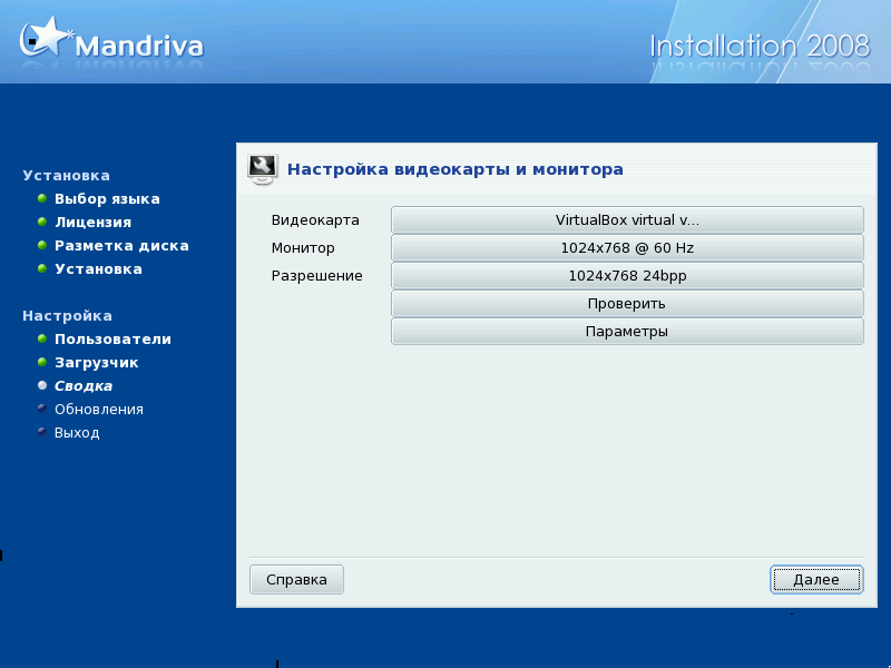 Графическая оболочка: по умолчанию DrakX настроит графическую оболочку с таким разрешением, которое наилучшим образом подходит как для монитора, так и для видеокарты. Если вас не устроит результат, или DrakX не сможет сделать автоматическую настройку (появится надпись настройка не удалась), нажмите на для ручной настройки графической оболочки. Нажмите на панели помощника настройки для получения полной справки по данному вопросу.