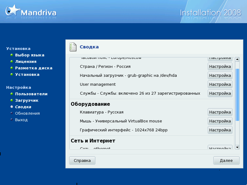 Сеть: здесь вы можете настроить доступ к Интернету или локальной сети. Для получения справки по данному вопросу ознакомьтесь с печатной документацией или используйте Центр Управления Mandriva Linux после завершения установки.