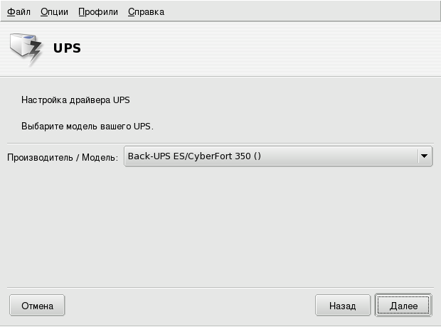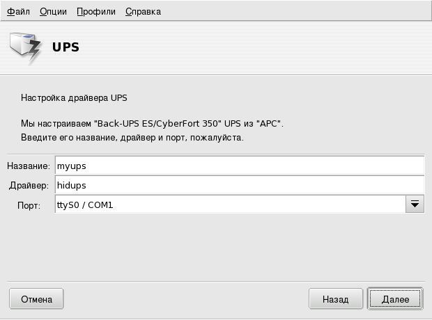 Автоматическая установка. Выбор опции Подключен в последовательный порт или по USB кабелю позволяет DrakUPS автоматически определить ваш ИБП.