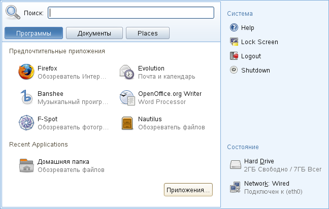 Если Вы уже знаете название приложения, но не уверены как его запустить из главного меню, используйте поле . Нажмите , введите часть названия приложения в поле , затем нажмите Enter. Если приложение установлено, то имя приложения появится в диалоге поиска. Кликните на имени для запуска программы.