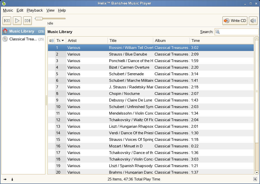 Используйте Helix Banshee для импорта CDs, синхронизации музыкальной коллекции с iPod*, проигрывания музыки напрямую с iPod, создания списков воспроизведения и создания аудио MP3 CD из песен вашей коллекции.