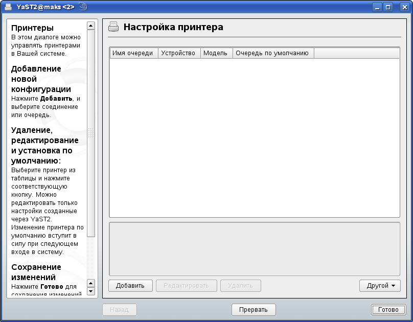 Вы можете настроить принтер с помощью YaST. Запустите YaST, Затем нажмите + для того, чтобы открыть главное окно настройки принтера. В зависимости от настроек сети или модели локального принтера, YaST может настроить принтер автоматически. Если автоматическое определение завершилось неудачей, нажмите в окне диалога для начала ручного процесса настройки. Следуйте инструкциям, переведенным в YaST online help. Если Вы не уверены в том, какую опцию выбрать или какую информацию вводить , уточните это у Вашего системного администратора.
