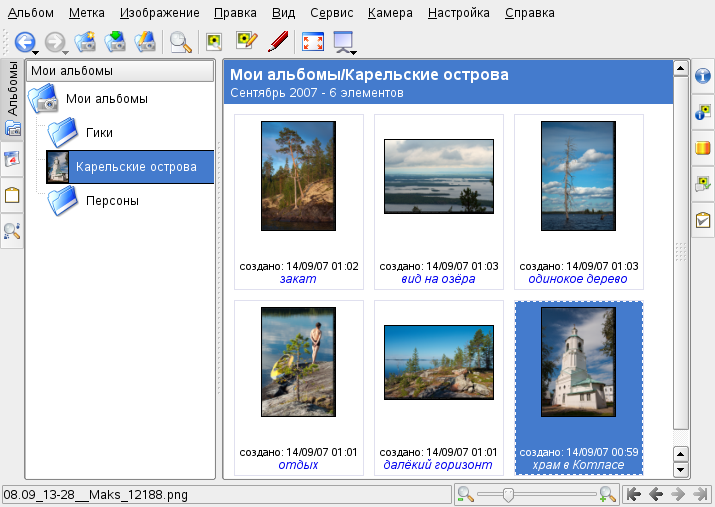 Главное окно digiKam содержит слева древовидное представление и показывает наброски изображений справа. Для быстрого доступа к вашим изображениям используйте боковую панель слева, которая позволяет вам переключаться между различными представлениями, сортировать изображения в соответствии с альбомами, тегами, датами и поисками. Для входа в режим digiKam просмотра и редактирования, дважды нажмите мышью на набросок изображения.