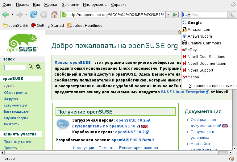 Помимо Konqueror openSUSE также включает в себя веб-браузер Firefox. Для запуска Firefox нажмите Alt+F2 и введите firefox.