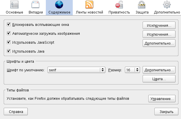 Firefox сочетает в себе последние веб-технологии, такие как использования вкладок, блокировка всплывающих окон а также загрузка и управление картинками. Легкий доступ к различным поисковым системам поможет вам найти нужную информацию. Для начала просмотра введите URL в адресную строку. Для открытия пустой вкладки в Firefox нажмите Ctrl+T и введите новый URL. Для открытия ссылки в новой вкладке нажмите среднюю кнопку мыши. Нажмите правой кнопкой мыши на вкладке для доступа к другим опциям. Вы можете создавать новые вкладки, перезагружать одну или все вкладки или закрыть их. Вы также можете изменить последовательность вкладок, перетаскивая их в нужное место.
