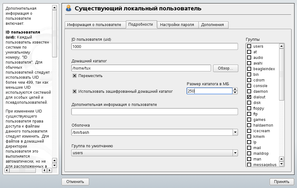 Для шифрования домашнего каталога существующего пользователя, выберите запись и нажмите .