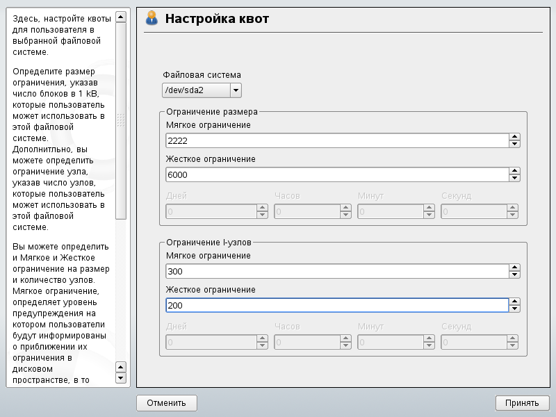 Ниже , ограничьте объем дискового пространства. Введите количество 1 kB блоков, которые пользователь или группа может иметь на этом разделе. Укажите значения и .