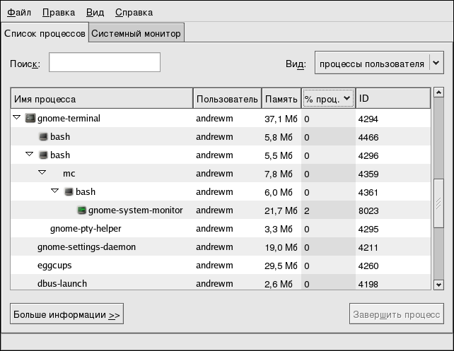 Однако Системный монитор GNOME делает ещё один шаг и предлагает графическое представление использования процессора, памяти и пространства подкачки, а также в виде таблицы показывает, как используется дисковое пространство. Пример того, как в Системном мониторе GNOME выглядит вкладка Список процессов (Process Listing) показан на рисунке 2-1.