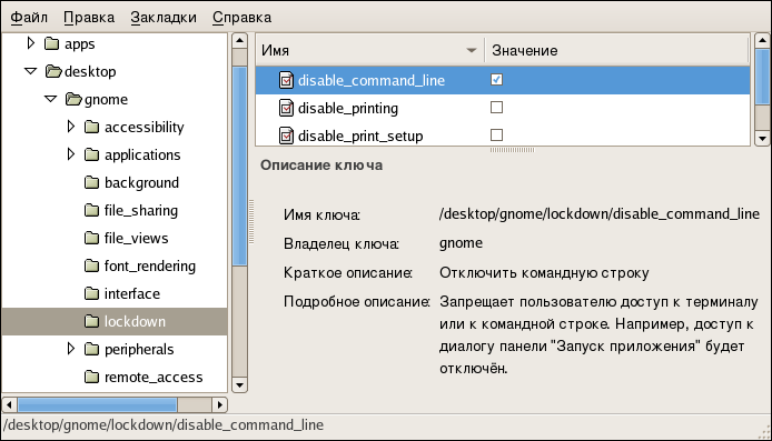 Установите значение параметра /desktop/gnome/lockdown/disable_command_line при помощи GConf редактора, как показано на Рисунке 4-6. Установка этого параметра также блокирует доступ к диалоговому окну панели Выполнить программу (Run Application).