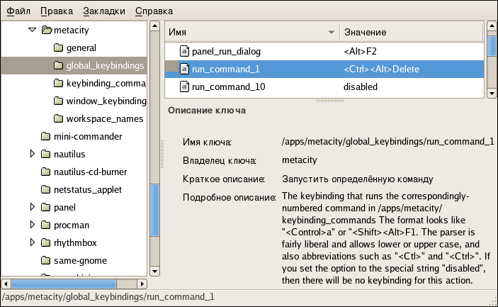 [Ctrl] -[Alt] -[Delete] установлена в параметр gconf run_command_1.Для изменения интерпретации оконным менеджером