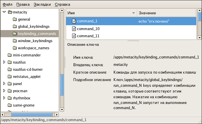 [Ctrl] -[Alt] -[Delete] , измените значение параметра run_command_1 с gnome-session-save --kill на что-либо иное, как показано на Рисунке 4-3. (Заметим, что изменяется соответственно параметр /apps/metacity/keybinding_commands/command_1).