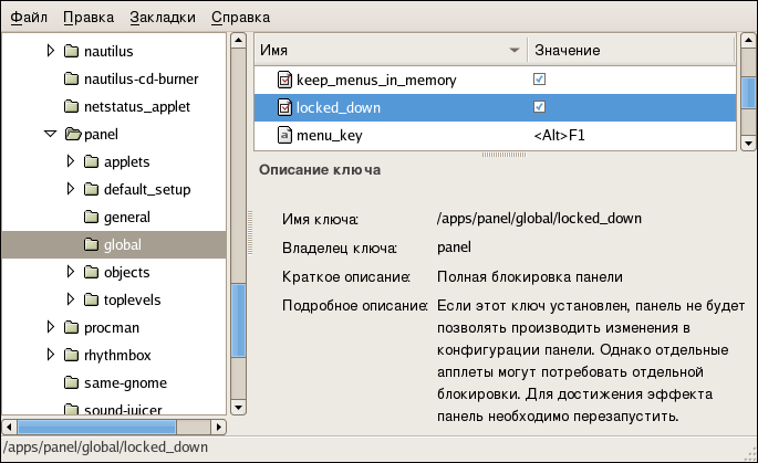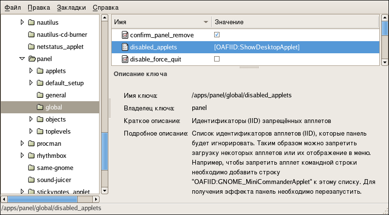 Например, для блокировки апплета Расчистить рабочий стол (Show Desktop) включите applet IID OAFIID:GNOME_ShowDesktopApplet в параметр /apps/panel/global/disabled_applets, как приведено ниже:Рисунок 4-5.