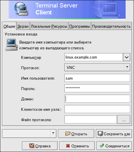 Минимальная настройка для подключения пользователем "sam"к рабочему столу Linux системы linux.example.com с использованием протокола VNC показана на Рисунке 5-3.