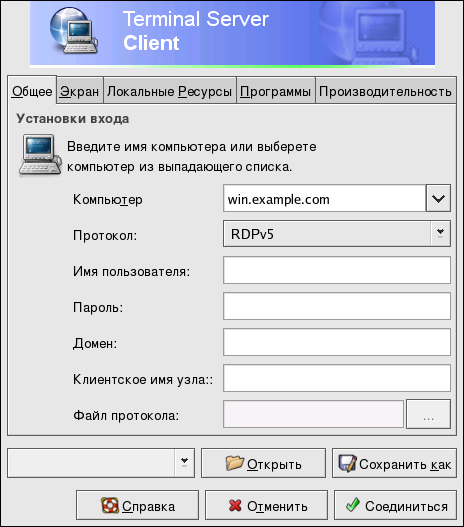 Минимальная настройка для подключения пользователем "sam"к рабочему столу Windows 2000™ системы win.example.com с использованием протокола RDPv5 показана на Рисунке 5-3.