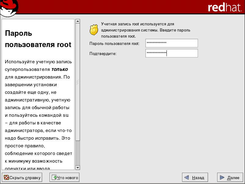 Назначение пароля для учётной записи root является одним из важнейших действий при установке системы. Учётная запись root похожа на учётную запись Администратор, используемую в Windows NT. Учётная запись root используется для установки пакетов, обновлений RPM, обслуживания и администрирования системы. Войдя в систему как root, вы получаете полный контроль над системой.