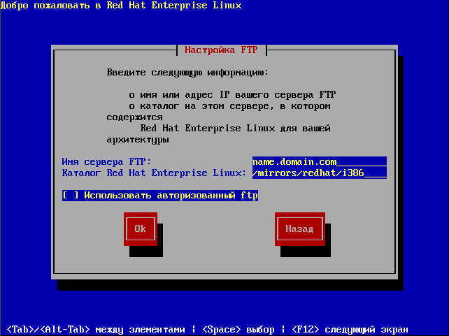 Введите имя или IP-адрес FTP-сервера, с которого вы будете выполнять установку, а также имя каталога, содержащего файлы установки RedHat/ для вашей платформы. Например, если FTP-сервер содержит каталог /mirrors/redhat/arch/RedHat/, введите /mirrors/redhat/arch/ (где arch заменяется типом архитектуры вашей системы, например, i386, ia64, ppc или s390). Если всё задано правильно, на экране появляется окно, сообщающее, что файл base/hdlist получен.