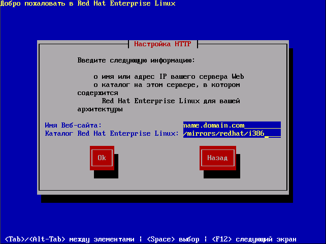 Диалог HTTP появляется, только если вы выполняете установку с HTTP-сервера (если вы выбрали HTTP в диалоге Метод установки (Installation Method)). В этом диалоге вы определяете HTTP-сервер, с которого будет выполняться установка Red Hat Enterprise Linux.