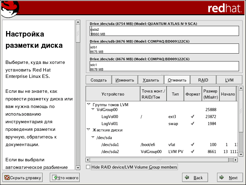 RAID: Используется для обеспечения избыточности нескольких или всех дисковых разделов. Используйте RAID, только если вы достаточно хорошо знакомы с этой технологией. За дополнительной информацией о RAID обратитесь к Руководству по системному администрированию Red Hat Enterprise Linux.