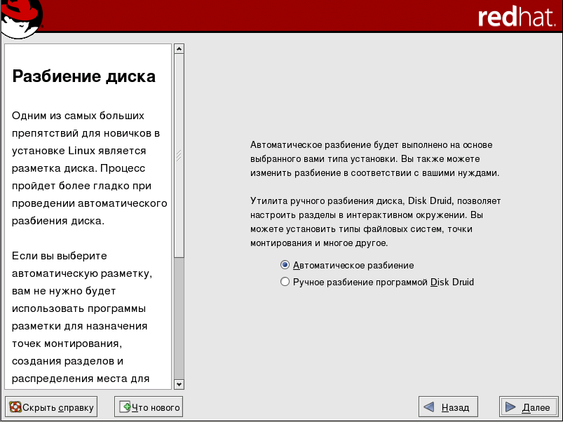 В этом диалоге вы можете выбрать, выполнять ли разбиение автоматически или вручную, с помощью Disk Druid.