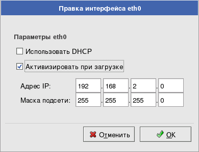 Выбрав сетевую плату, нажмите кнопку Изменить (Edit). Во всплывающем диалоге Правка интерфейса (Edit Interface) вы можете определить, будет ли IP-адрес и маска сети назначаться через DHCP (или вручную, если DHCP не используется) и будет ли устройство запущено при загрузке системы. Если вы установите флажок Активизировать при загрузке (Activate on boot), сетевой интерфейс запустится при загрузке системы. Если вы не можете получить DHCP настройки или не знаете, какие значения параметров использовать, обратитесь к вашему сетевому администратору.
