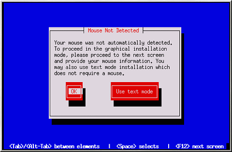 Вы можете продолжить графическую установку или выполнить её в текстовом режиме, не требующем наличия мыши. Если вы продожите установку в графическом режиме, вам будет предложено предоставить программе установки сведения о конфигурации мыши.