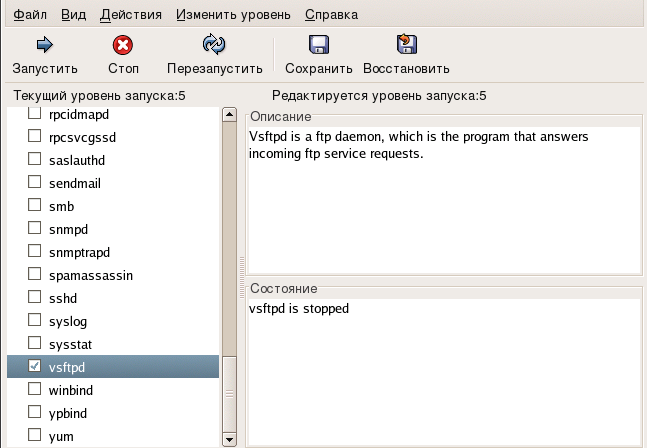 В Red Hat Enterprise Linux входят три программы, предназначенные для включения и отключения служб. Это Настройка служб (Services Configuration Tool) (system-config-services), ntsysv и chkconfig. Информацию о них вы найдёте в главе Управление доступом к службам Руководства по системному администрированию Red Hat Enterprise Linux.