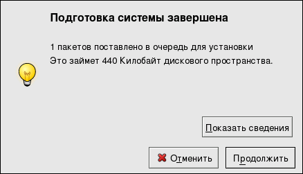 Выбрав группы пакетов и отдельные пакеты для установки, нажмите в главном оке кнопку Обновить (Update). В окне кратких сведений выводится информация о пакетах, в частности, число устанавливаемых пакетов, объём диска, требуемый для установки пакетов, а также все зависимости пакетов. Если пакет зависит от других, они автоматически будут добавлены в список устанавливаемых пакетов. Нажмите кнопку Показать сведения (Show Details), чтобы просмотреть полный список устанавливаемых пакетов.