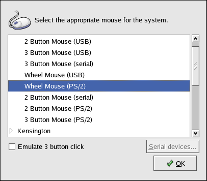 Если выбран последовательный порт, нажмите кнопку Последовательные устройства (Serial devices) для выбора подходящего номера последовательного устройства мыши, например /dev/ttyS0.