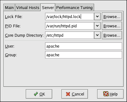 Значение параметра Каталог файлов Core (Core Dump Directory) соответствует указанию CoreDumpDirectory. HTTP-сервер Apache пытается перейти в этот каталог, прежде чем сбросить дамп памяти. По умолчанию используется значение ServerRoot. Однако, если пользователь, от имени которого запущен сервер, не имеет права записывать в этот каталог, дамп памяти сохранён не будет. В качестве значения параметра определите имя каталога, в который пользователь, от имени которого работает сервер, сможет записывать данные, если вы хотите собирать дампы памяти для отладки.