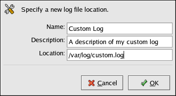 Укажите имя, описание и размещение добавляемого файла журнала. Если этот файл существует, сразу после нажатия OK, он немедленно добавляется в область просмотра.