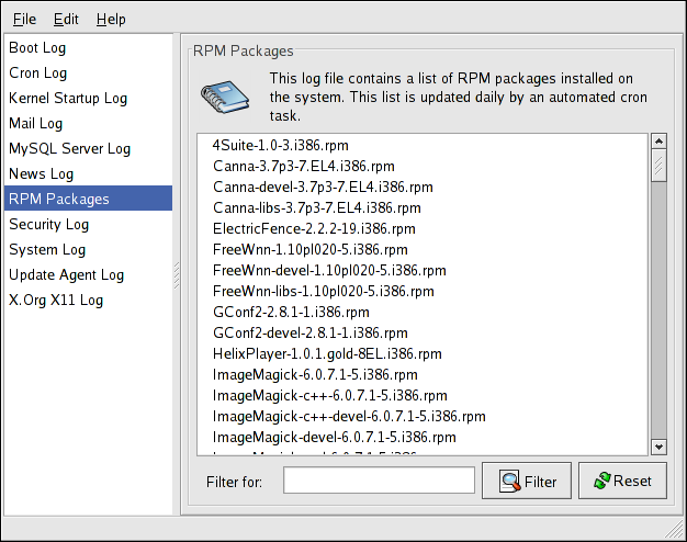 Чтобы просмотреть файлы журналов системы в интерактивном приложении реального времени, воспользуйтесь программой Системные журналы (Log Viewer). Чтобы её запустить, выберите в главном меню Приложения (Applications) (на панели) => Система (System Tools) => Системные журналы (System Logs) или введите команду system-logviewer в приглашении оболочки.