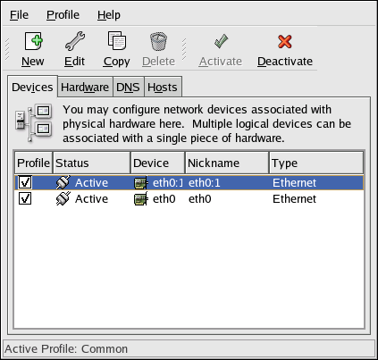 Настроив для устройства Ethernet (например, eth0) статический IP-адрес (DHCP с псевдонимами не поддерживается), перейдите на вкладку Устройства (Devices) и нажмите кнопку Создать (New). Выберите плату Ethernet, для которой вы хотите настроить псевдоним, определите статический IP-адрес псевдонима и нажмите Применить (Apply), чтобы его создать. Так как устройство для Ethernet-платы уже существует, для псевдонима создаётся ещё одно (например, eth0:1).