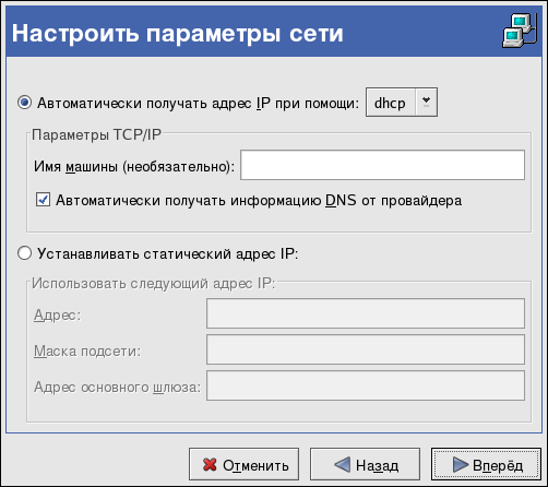 В окне Настроить параметры сети (Configure Network Settings), показанном на рисунке 18-2, выберите между DHCP и статическим IP-адресом. Если устройство получает разные IP-адреса при каждом подключении к сети, не указывайте имя узла. Нажмите Вперёд (Forward) для продолжения.