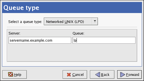 Выберите вариант Сетевой принтер UNIX (Networked UNIX) (LPD) в меню Выберите тип очереди (Select a queue type) и нажмите Вперёд (Forward).