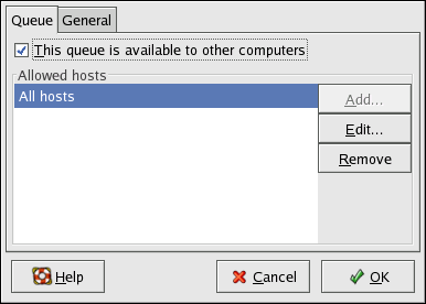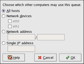 Когда вы открываете доступ к очереди, печатать на данном общем принтере по умолчанию могут все компьютеры. Предоставление доступа к очереди печати всем компьютерам в сети может быть опасным, особенно, если ваш компьютер напрямую подключен к Интернету. Это рекомендуется изменить, выбрав запись Все узлы (All hosts) и нажав кнопку Изиенить (Edit), чтобы вызвать окно, показанное на рисунке 34-18.