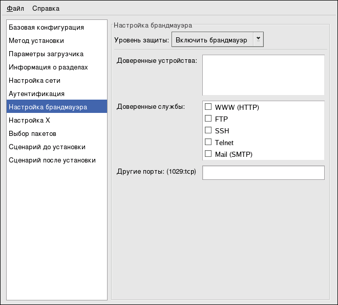Окно Настройка брандмауэра (Firewall Configuration) похоже на аналогичный диалог в программе установки и в средстве Настройки уровня безопасности (Security Level Configuration Tool).