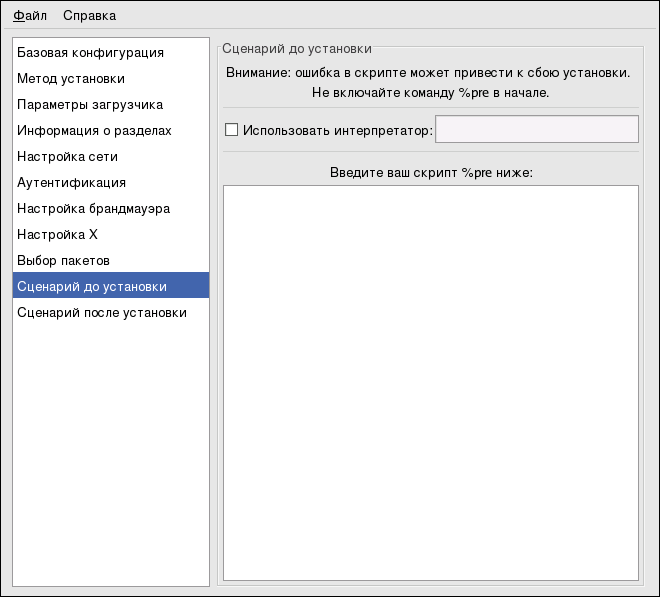 Вы можете определить команды, которые будут выполняться в системе до начала установки, сразу после загрузки файла kickstart. Если вы определили в файле kickstart параметры сети, сеть будет настроена до обработки этого раздела. Чтобы задать сценарий, выполняемый перед установкой, введите его в представленной текстовой области.