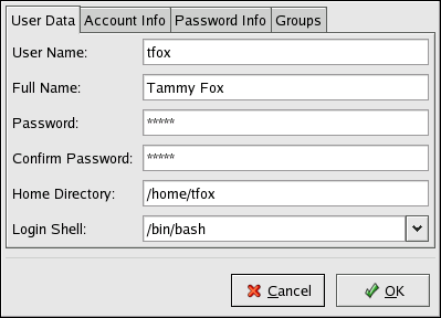 Данные пользователя (User Data) — Содержит основные свойства пользователя, настраиваемые при создании пользователя. На этой вкладке вы можете изменить полное имя пользователя, пароль, домашний каталог или оболочку.