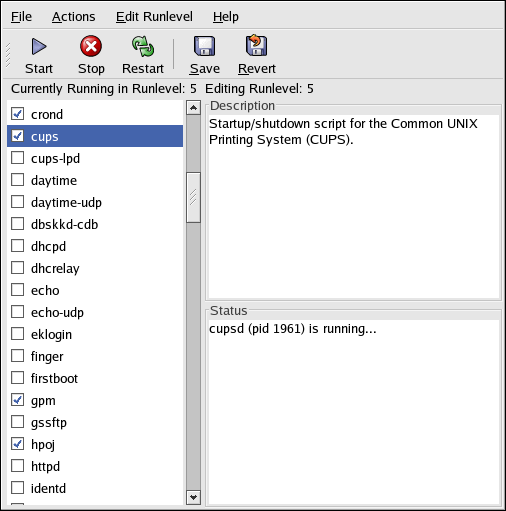 Чтобы запустить Средство настройки служб с рабочего стола, выберите в Главном меню (Main Menu) (на панели) => Системные параметры (System Settings) => Настройки сервера (Server Settings) => Службы (Services) или введите команду system-config-services в приглашении оболочки (например, в XTerm или терминале среды GNOME).