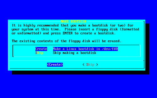 Создание загрузочного диска для использования в будущем - это неплохая идея. У вас есть возможность отформатировать дискету, а затем создать загрузочный диск одного из двух типов. Первый тип - простой - просто записывает (см. рисунок) ядро на дискету. Более гибким (и настоятельно рекомендуемым) вариантом является lilo, в котором, конечно же, также будет создан загрузочный диск с lilo. Дополнительную информацию о LILO смотрите в Разд. 7.1. Также вы можете выбрать continue (продолжить), при этом загрузочный диск создан не будет.