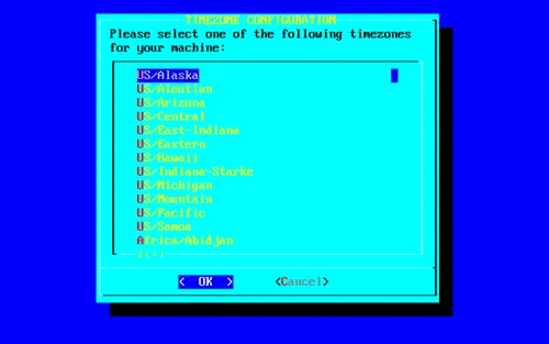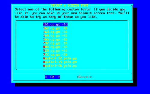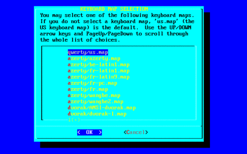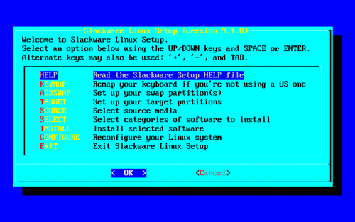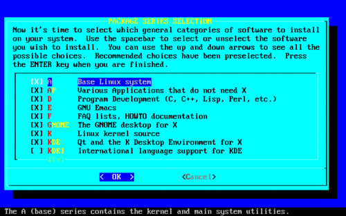 Процесс установки выглядит примерно так: вы проходите все этапы программы setup в порядке их перечисления. (Конечно же вы можете выполнять их почти в произвольном порядке, однако есть шанс, что не всё будет потом нормально работать.) Пункты меню выбираются с помощью клавиш со стрелками вверх и вниз, а кнопки “Okay” и “Cancel” затем выбираются при помощи клавиш влево и вправо. С другой стороны любой пункт можно выбрать с помощью соответствующей клавиши, подсвеченной в названии пункта. Опции, имеющие маркеры выбора (т.е. со знаком [X]), переключаются с помощью пробела.