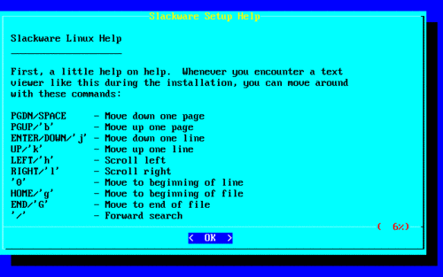 Если это ваша первая установка Slackware, вам может понадобиться обратиться к окну со справкой. Она даст вам описание каждой части setup (довольно похожее на то, что мы сейчас представим, однако менее подробное) и инструкции для навигации при дальнейшей установке.