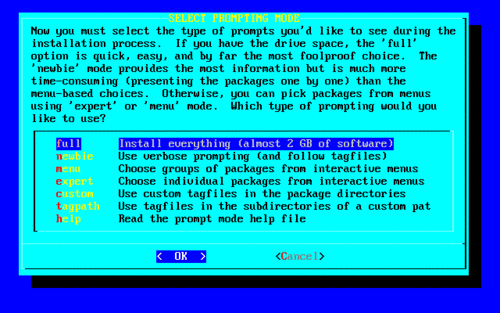 Пункт full установит все пакеты изо всех категорий программного обеспечения, которые вы выбрали в разделе “select”. Дальнейший процесс будет полностью автоматическим. Это самый простой способ установки, поскольку вам не нужно принимать никаких решений об установке того или иного пакета. Конечно же для этого варианта требуется больше всего дискового пространства.