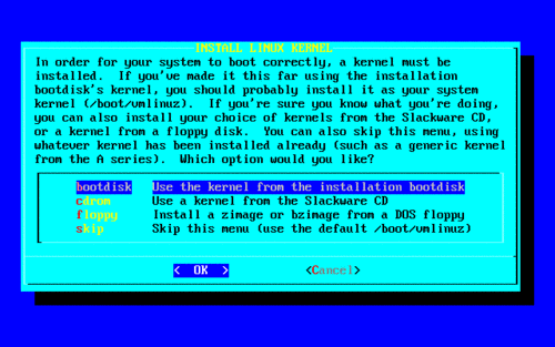 Здесь вам будет предложено выбрать ядро для установки. Вы можете взять ядро с загрузочного диска, который вы использовали при установке, с компакт-диска со Slackware или с другой подготовленной дискеты (если вы, конечно, позаботились об этом заранее). Или же вы можете пропустить этот этап. В этом случае будет установлено ядро по умолчанию.