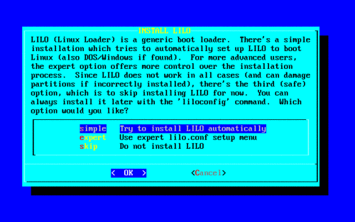 Если Slackware является единственной операционной системой на вашем компьютере, для вас вполне должно хватить пункта simple. Если вы используете двойную загрузку, тогда лучше выбрать expert. Дополнительную информацию о двойной загрузке смотрите в Разд. 7.3. Третий вариант - do not install - рекомендуется только в том случае, если вы понимаете, что делаете, и у вас есть веская причина для отказа от установки LILO. Если вы выполняете установку в режиме эксперта, вам будут предложены варианты местоположений для установки LILO. Вы можете установить его в MBR (Master Boot Record, главная загрузочная запись) своего жёсткого диска, в суперблок корневого раздела Linux или на дискету.